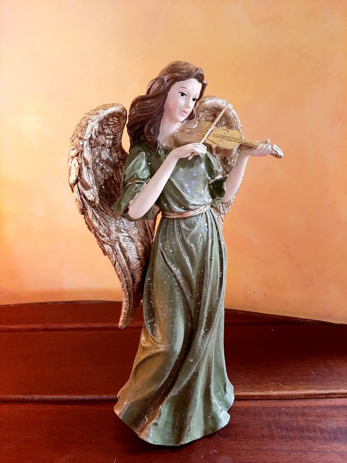 Feito em resina e pintado à mão, as asas são douradas e as vestes em verde com glitter. Altura 30 cm, largura 14 cm e profundidade 11 cm.