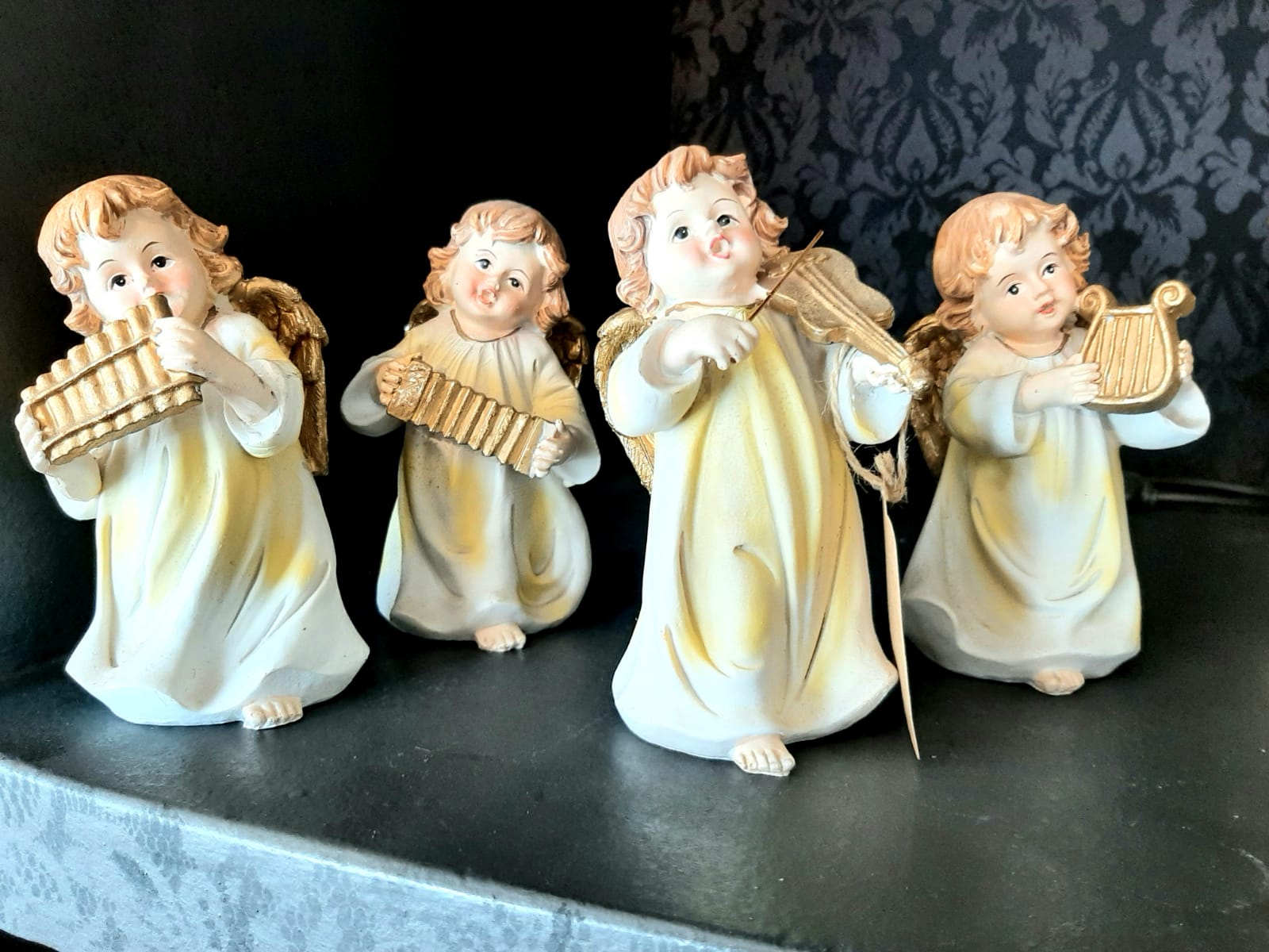 Conjunto de quatro anjos tocanda cada um um instrumento diferente, feirtos em resina e medindo 15 cm de altura cada um.