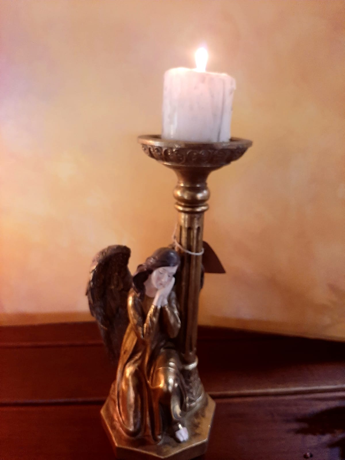 Castiçal para velas de até 8 cm de diâmetro, feito em resina e pintado à mão. Altura 31 cm e base octogonal de 12 cm por lado. (Não acompanha a vela e pote de plantas que se mostram nas fotografias para fins decorativos).